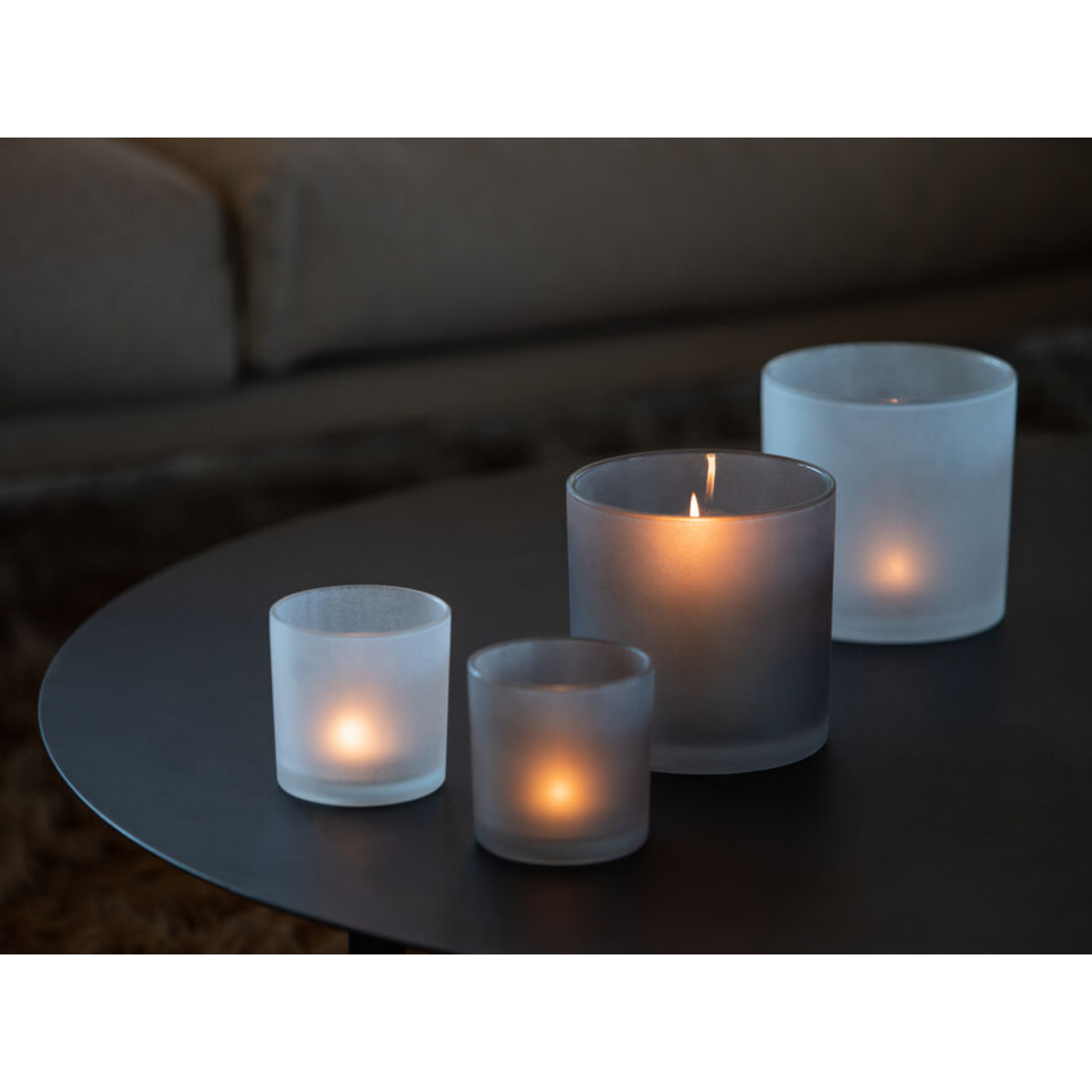 Frostad glaslykta som sprider ett mjukt och varmt ljus